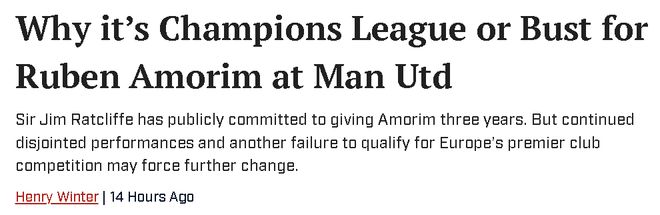 曼联需要欧战顶级赛事带来的经济效益和声望,届时阿莫林将已经执教80场比赛,足以让他磨合球员,并确立自己的战术风格。阿莫林至今的60场比赛,只取得23胜21负16平的成绩,球队甚至长时间落后于升班马桑德兰。
