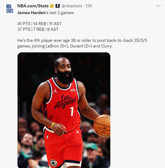 这场比赛哈登38分钟,22中9,三分11中5,罚球15中14,拿到37分8助攻7篮板1抢断,背靠背两场比赛至少35+5+5,成为联盟第四位36岁以上背靠背至少两战35+5+5的球员,比肩詹姆斯、杜兰特、库里。