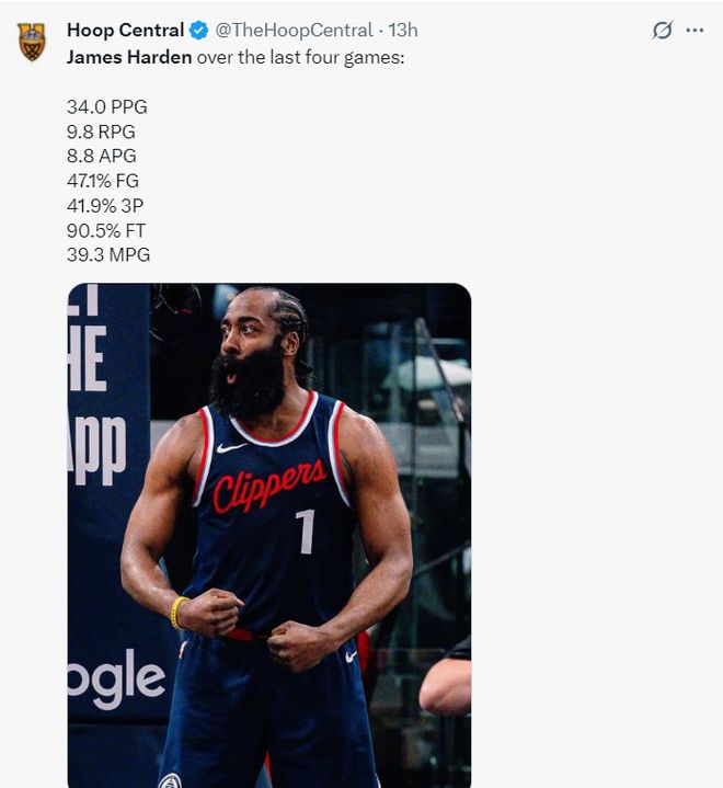 过去的四场比赛哈登场均39.3分钟,拿到34分9.8篮板8.8助攻,命中率47.1%,三分命中率41.9%,罚球命中率90.5%,快船这不是吸血哈登是什么?