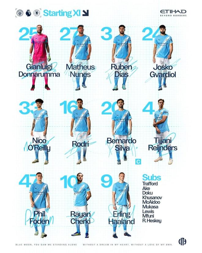 曼城vs切尔西:哈兰德、多纳鲁马首发,帕尔默、恩佐-费尔南德斯出战
